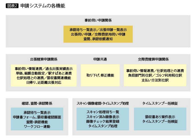 新システムの流れは、以下のようになる(図表1、図表2)。まず出張であれば行先、目的、日時など、交際費・会議費であれば相手や目的、予算などを記入した「伺い申請」を起票する。