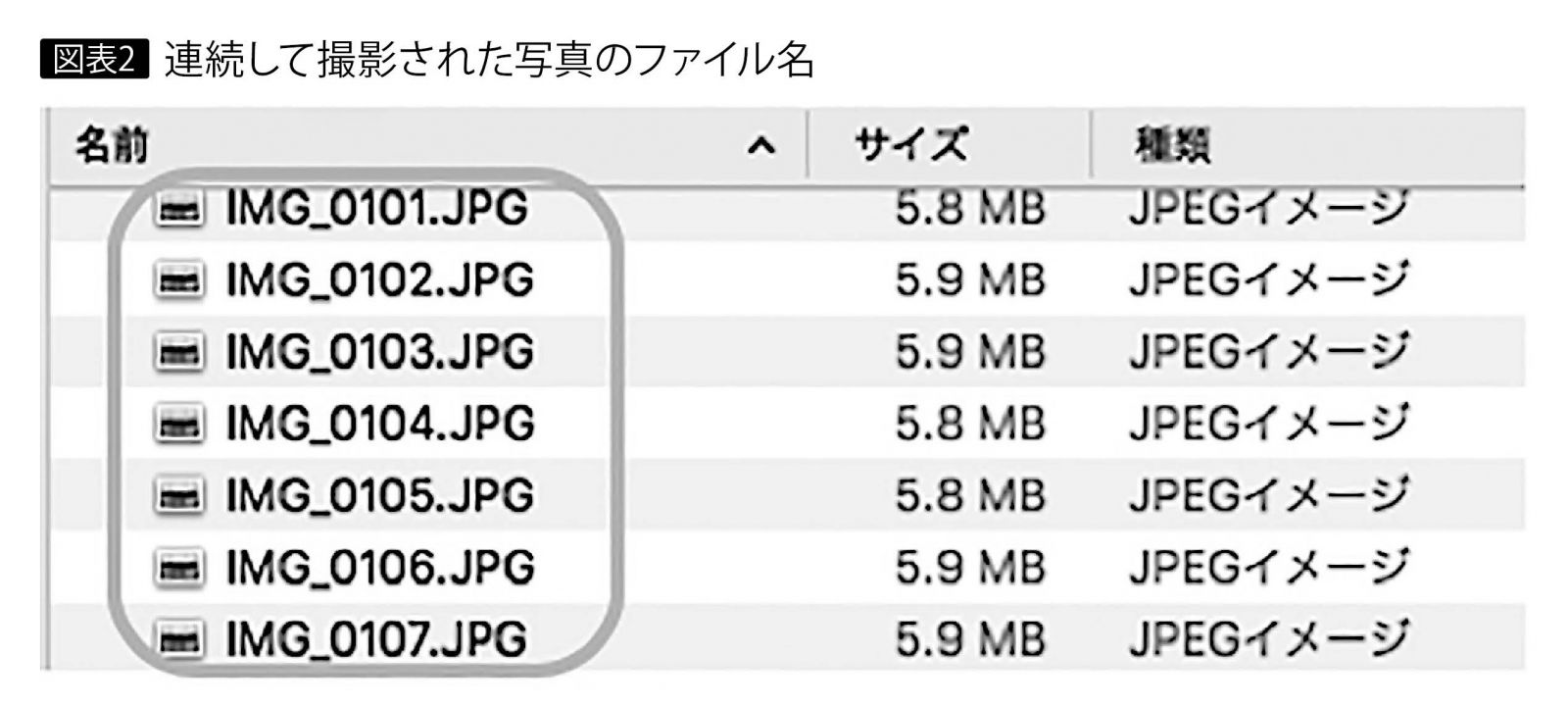 たとえば、連続して撮影した7枚の人物写真は、ファイル名が連続した異なる数字であるのでそれぞれが違う写真であることはわかるが、人物が目をつぶっているのか笑っているのか、ファイル名からは判断できない。そのため1枚だけを選んで分析対象とする場合は、選別が困難である(図表2)。