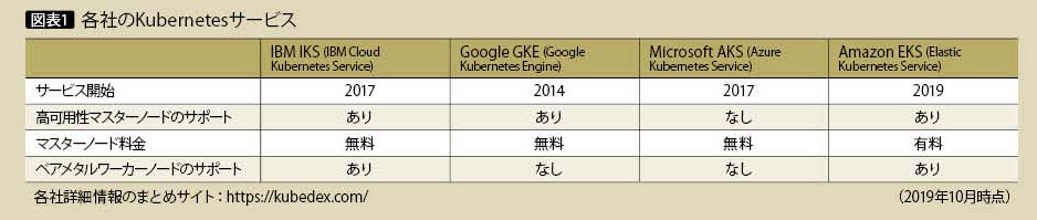 少し以前はKubernetesをサポートしないクラウド環境も多かったようだが、直近ではほとんどのクラウド基盤でKubernetesをサポートしている。図表1は、各社クラウド上でのKubernetesサービスである。