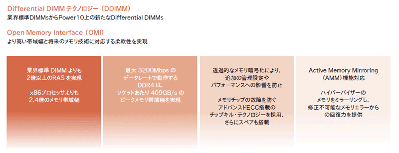メモリは、Differential Dual Inline Memory Module(DDIMM)テクノロジーを採用し、業界標準のISDIMMと比較してメモリ可用性が2倍に向上している(Power S1012 は ISDIMMを使用)。