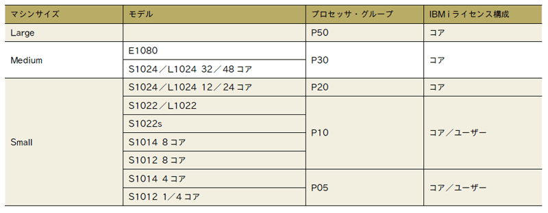 IBM iソフトウェアのライセンスは、ハードウェアモデル/マシンサイズに基づいて決定される。Powerハードウェア・プラットフォームには、3つのマシンサイズ・グループ(Small、Medium、Large)が存在する。IBM iの場合、マシンサイズ・グループにマップされるプロセッサ・グループ(別名「ソフトウェア層」)が存在する。