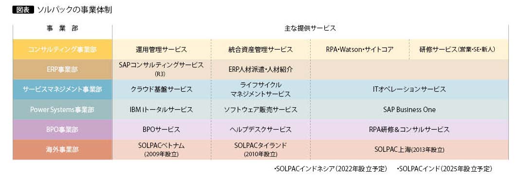 藤田 当社は、AS/400(IBM i)の草創期に「PACKシリーズ」という業務パッケージ・シリーズを企画した経歴をもつ前社長(現・代表取締役会長の藤田勉氏。藤田氏の尊父)が、1997年に日本IBMを退職して仲間6人と設立した会社です。最初はPACKシリーズの保守サービスからスタートしましたが、その後、IBM iのことなら何でもご支援するトータルサービスへとカバレッジを広げ、それと並行して、SAP、研修、運用、BPO、人材などのサービスを事業化していき、2008年からは海外への進出も始めました。現在は、6事業部の体制を敷いています(図表)。