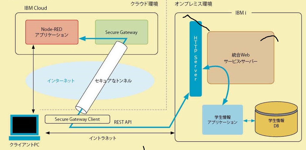 最後に、オンプレミスのIBM i上で稼働する統合Webサービス・サーバーのAPIに、Secure Gateway経由で、IBM Cloud上のNode-REDアプリケーションからアクセスする。