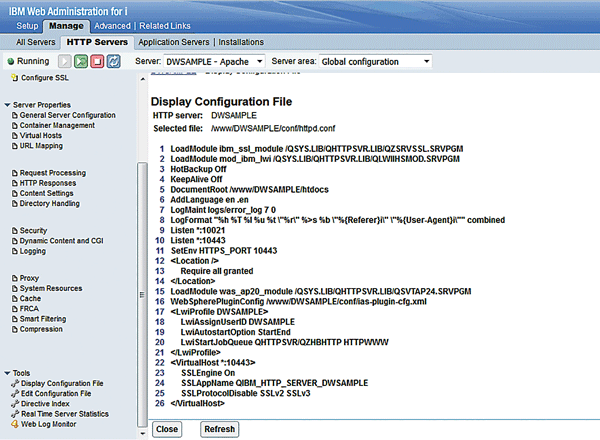 統合Webサービス・サーバーのSSLポートを設定したあと、Web Administration for i (またはHTTP Admin)の左のナビゲーションビューに表示されるToolsセクションの「Display Configuration File」で設定を確認する。図表2のように、構成ファイルにSSL設定が追加されている。