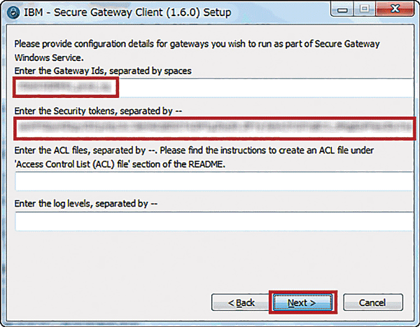 (8) ウィザードの次のページに、ゲートウェイIDとセキュリティトークンを入力する。この情報は、インストーラをダウンロードしたWebページで確認できる。そのWebページから値をコピーし、ウィザードにペーストする。この例では、アクセス制御リスト(ACL)およびログレベルフィールドは空白のままにする。「Next」をクリックする(図表3)。