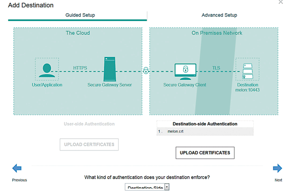 (15) 接続先で認証を使用するために「Destination-Side」を選択し 、「UPLOAD CERTIFICATES」をクリックする。