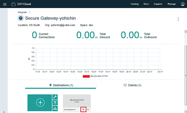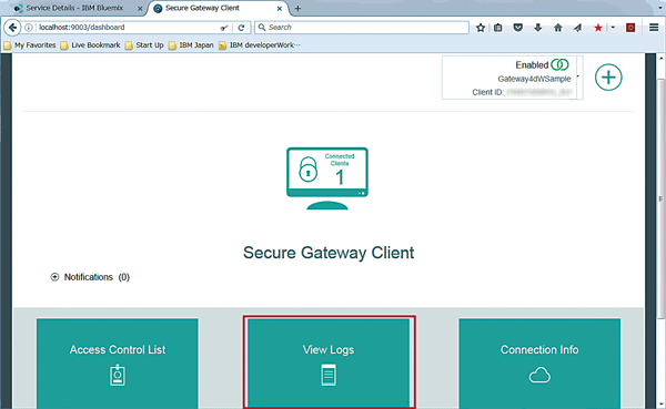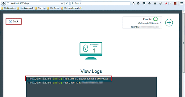 これで、ローカルPC上で動作するIBM CloudおよびSecure Gateway ClientにSecure Gateway Serverが正常に接続した。