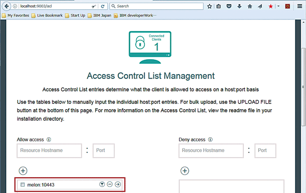 (24) 「AccessControl List Management」ページの「Allows access」下にある統合Webサービス・サーバーのホスト名とHTTPSポート番号を入力し、「+」ボタンを押す(図表8)。