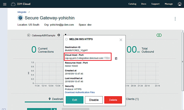 (28) ここで、追加した接続先の詳細を確認できる(図表10)。「Cloud Host:Port」は、IBM Cloudからアクセスするホスト名およびポートの詳細を指す。このアドレスを使用するとSecure Gateway経由で、オンプレミスの接続先に透過的にアクセスできる。このアドレスは、あとでNode-REDアプリケーションをデプロイするときに必要となる。