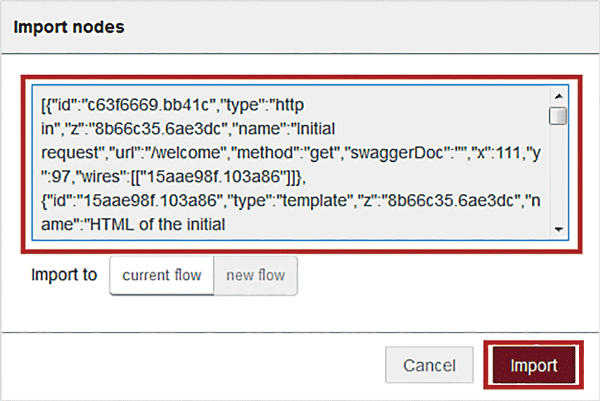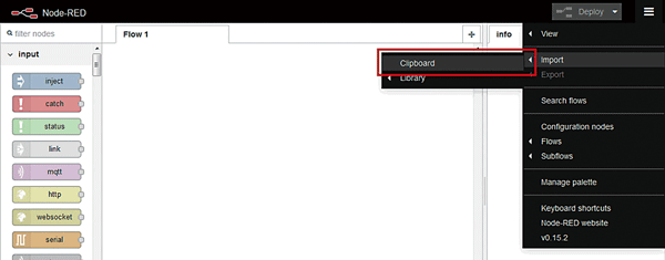 (3) フローエディタがブラウザで起動する。JSON形式で記述されたNode-REDフローをインポート/エクスポートする。サンプルアプリケーションを含む「node-red-dw-sample-yohichin-flow.json」という添付サンプルをダウンロードし、インポートする。フローエディタの右上にある「Import」→「Clipboard」をクリックする(図表11)。