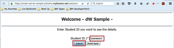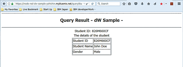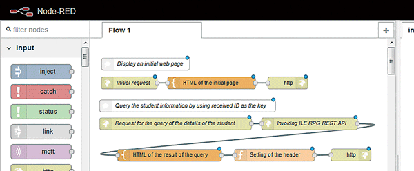 インポートされたフローは、大きく2つある。1つは、https://<your-node-red-app-host-name>.mybluemix.net/welcome にアクセスして、最初のWebページを表示すること。もう1つは、最初のページから学生IDを取得し、そのデータをSecure Gateway経由でIBM i上のRESTベースのWebサービスに渡すことである。REST Webサービスは受信したIDをキーとして学生情報を照会し、その結果をWebページに返す。