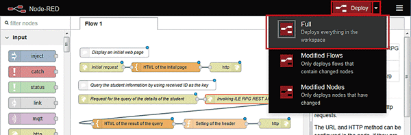 (7) アプリケーションをランタイムにデプロイするには、右上の「Deploy」の横にある下向き矢印、そして「Full」をクリックする。次に「Deploy」をクリックして、アプリケーションをデプロイする(図表15)。