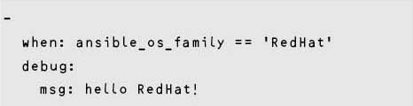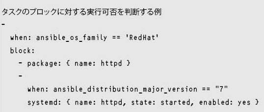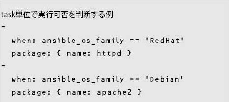 when:を使用することで、タスク単位の実行可否を判断できる。when:の条件はand、or、notを用いて操作できる。配列に含まれるかどうか、文字列が含まれるかどうかを判断するPythonのin演算子なども使用できる。