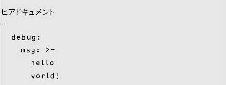 ハッシュの値として“|”, “>”といった記号を記述すると、以下に続くインデントされた連続のブロックが文字列として受け渡される。“|”は各行の改行を含み、“>”は各行を1スペースで連結する。またこれらに“-”を追加した“|-”、“>-”を使用することで、最後の改行を取り除ける。