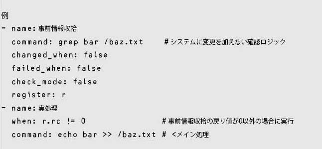 とくにshellやcommandモジュールなどで、実行するか省略するかを判断するために、事前に別途、情報収拾タスクを実行するような実装がよく見られる。その情報収拾タスクは、変更を行わないロジックとしたうえで、changed_when: false、failed_when: false、check_mode: falseを指定し、実処理ではrcなどで判断させるような実装が推奨される。