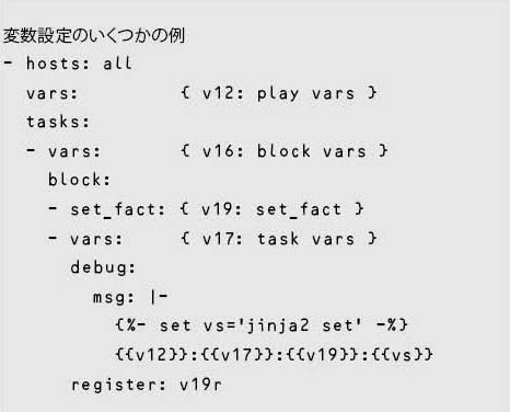 play varsの有効範囲はplay、block varsはblock、task varsはtaskとなる。これらの「プレイブックオブジェクトスコープ」変数は、後続のオブジェクトでは使用できない。