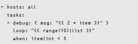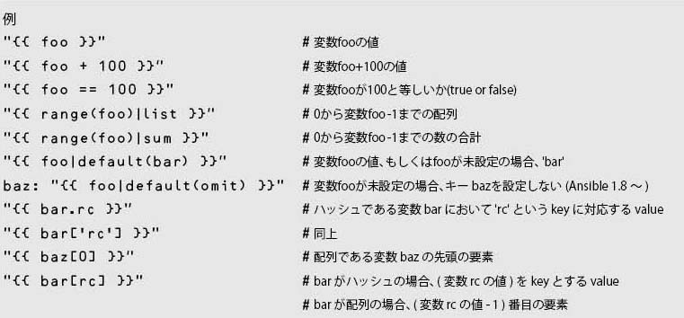前述したように、Ansibleでの変数VARの参照は、Jinja2を用いて、{{ VAR }}により行う。ここでは演算やフィルターが利用できる。フィルターとは、[0,1,2]|sumのsumのように、“|”の前の値に対する操作であり、多くのフィルターが提供されている(Filters – Ansible Documentation、Template Designer Documentation: List of Builtin Filters )。
