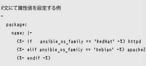 値部分に、Jinja2テンプレートエンジンによるif文を使用できる。ただし、Playbookでのロジックを表す部分の構文をjinja2で変更することはできない。
