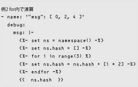 ここでは、“[“, “]”の間に、forループより、文字列として“0,”“2,”“4,”を追加し、文字列“[0,2,4,]”を作成する。“,”が余計に付いているが、(JSONとは異なり)YAMLでは問題なく、配列[0,2,4]として解釈される。