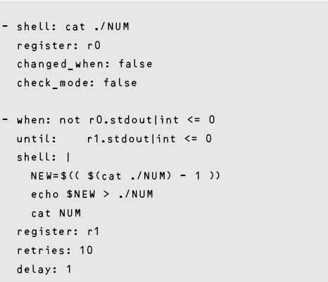 この例では、shellタスクのstdoutが0以下になるまで、もしくは最大でretries:指定の10回まで処理を繰り返す。retries:は省略可能だが、デフォルトは3回なので注意が必要である。条件には、コマンドのstdout、stderr、rcなどが使用可能である。コマンド実行結果を判断に使用するため、until:の条件を満たしていても最初の1回は実行される。