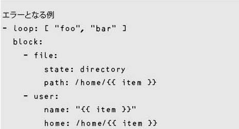 loop:は、与えられた配列の要素ごとにループを行う。ループ変数は、デフォルトでは {{ item }} が使用される。ループさせる要素をハッシュなどにすることで、多くの属性をまとめて設定できる。