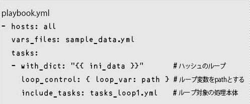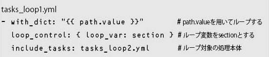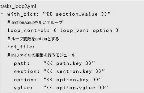 include_tasks:に対してループを実行する。path.keyがファイルのパス名で、path.valueが属性になる。なおwith_dict: “{{ ini_data }}”は、loop: “{{ ini_data|dict2items }}”と書いてもよい。