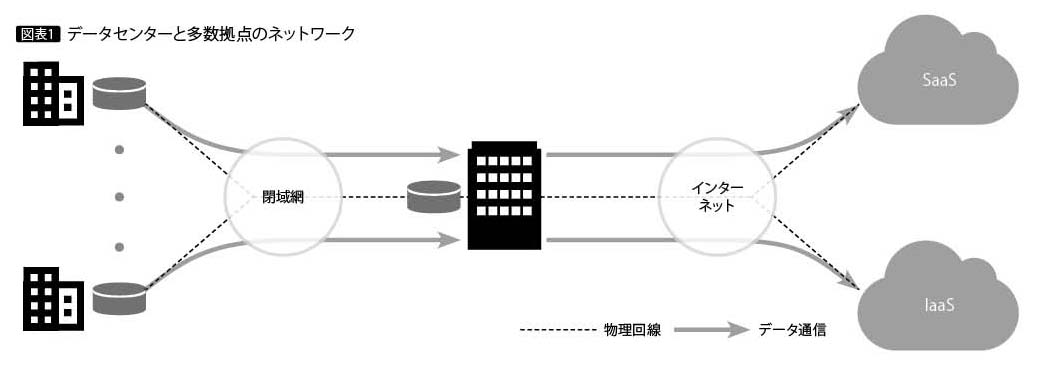 これまで各拠点のユーザーがクラウドへアクセスする通信は、一度データセンターで集約してからインターネット回線へアクセスする構成で対応できていた。しかしクラウド宛ての通信が増加している状況では、データセンターの既存の回線帯域では対応できなくなっている。