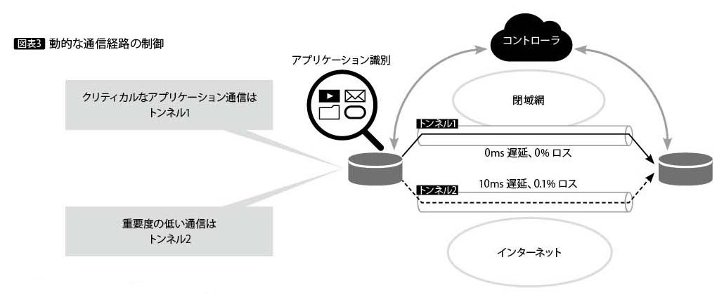 これに対してSD-WANでは、回線の品質状態を把握するのに加え、アプリケーション種別の識別も可能なので、重要度の高いアプリケーションを遅延の少ない回線にルーティングするなど柔軟に経路を選択できる (図表3)。
