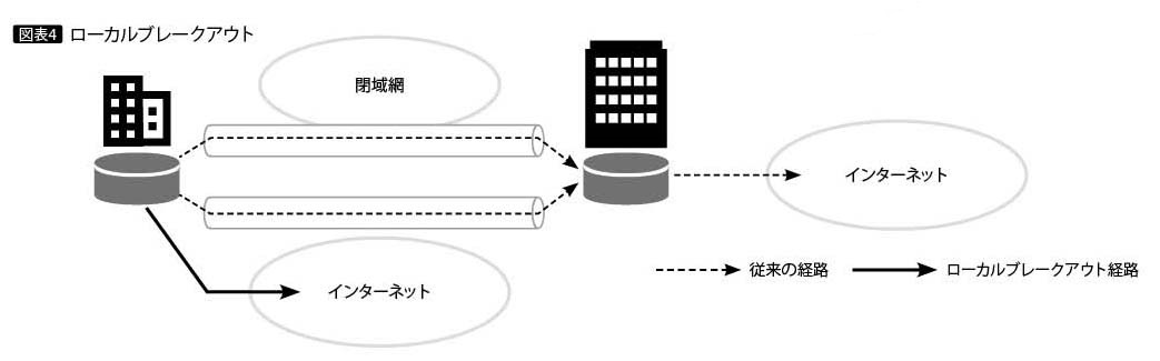 ローカルブレイクアウトは任意のアプリケーションを拠点から直接インターネットへ通信させる構成であり、データセンターの回線やWAN回線の負荷軽減、ユーザーの通信遅延解消を実現する(図表4)。