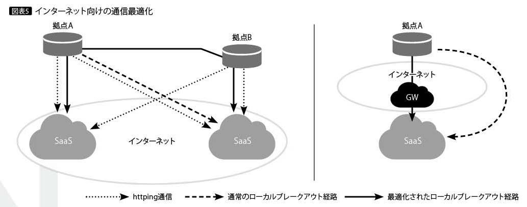 あるベンダーでの実装を一例として挙げてみよう。ここでは各拠点のルータが定期的にSaaSサーバーへhttpingを行う。その結果から、自拠点より他拠点を経由した経路での応答時間が優れている場合、自拠点から直接インターネットアクセスするのではなく、他拠点を経由してSaaSへアクセスさせることで、インターネット向け通信の品質を保つ(図表5の左)。