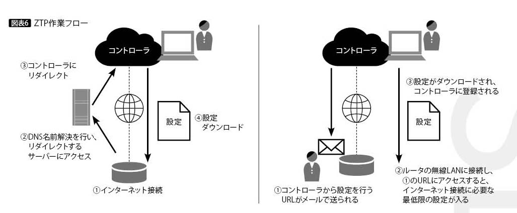 ZTPを使用してルータがコントローラから設定をダウンロードする手順は、ベンダーごとに異なる。たとえばルータにあらかじめプリセットされたZTPサーバーに接続し、ZTPサーバーはシリアル番号から所有者を識別し、所有者が管理するコントローラへリダイレクトする(図表6の左)。