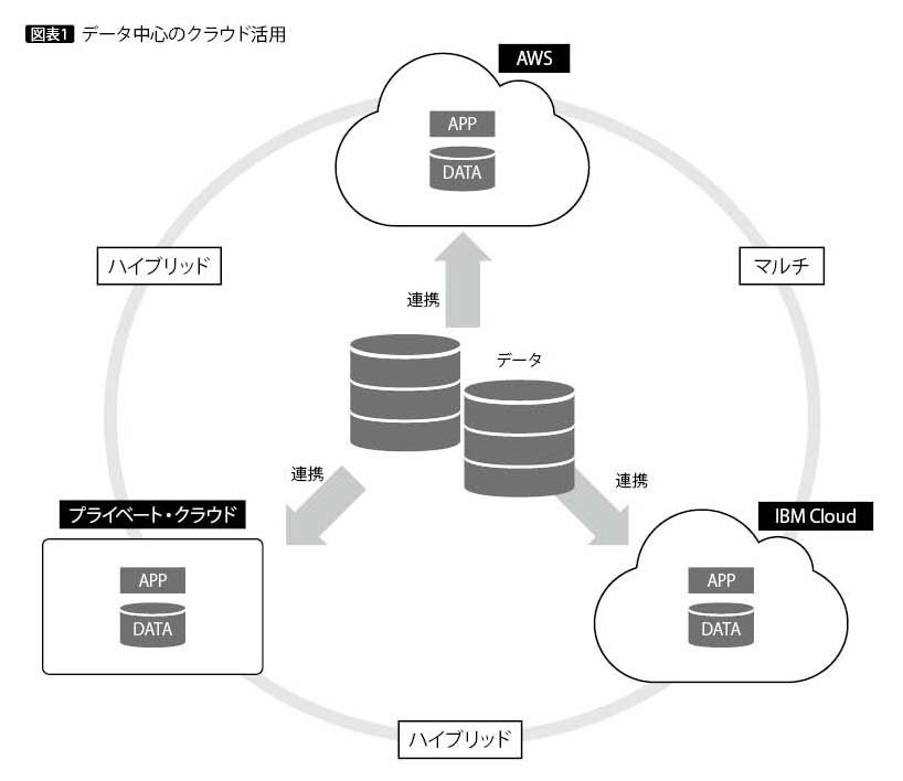 そこでIBMはプライベート・クラウドも含め、複数のパブリック・クラウド間を連携するハイブリッド・マルチクラウド環境を推奨している。適材適所にデータを配置し、必要に応じて互いにデータを連携して利用する形態である(図表1)。