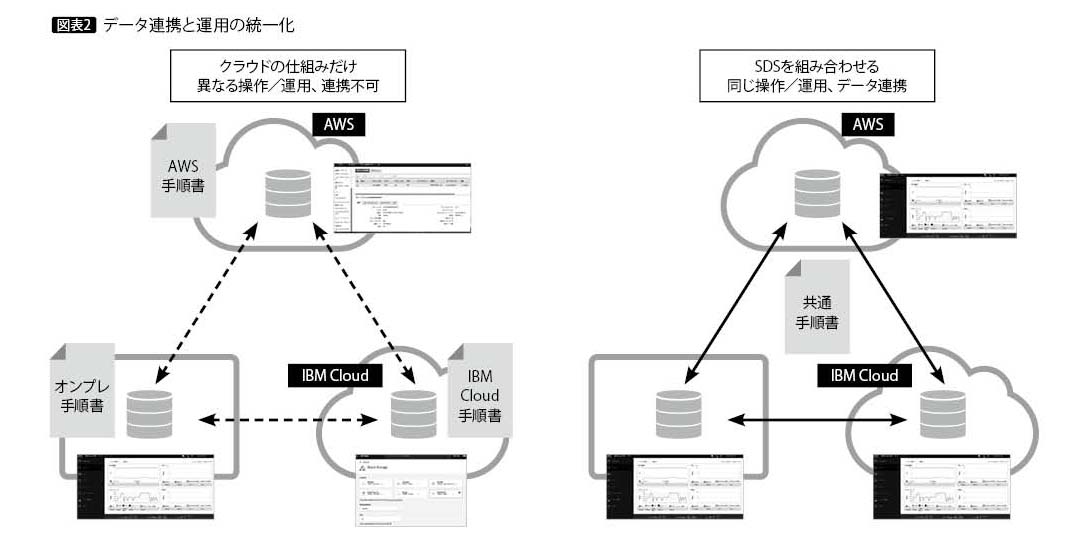 このようにハイブリッド・マルチクラウド環境にSDSを組み合わせることで、クラウド・サービス活用の幅を広げられる。適材適所にデータを配置し、必要に応じて各クラウド・サービス間でデータを移動させるなど、データの流れを整えることが可能になる(図表2)。