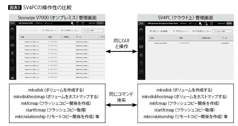 IBM CloudとAWSで実装方法は異なるものの、実装後に両クラウド・サービスで構成されたSpectrum Virtualizeは同一である。GUI画面や操作性も、同じように使用できる(図表3)。