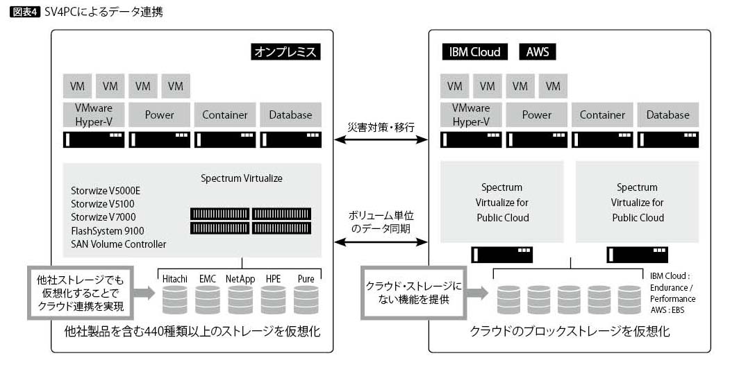 SV4PCは従来からの先進的なストレージ機能を備え、クラウド・サービスで提供されるストレージ・リソースの仮想化を実現する。あたかもクラウド・サービス上に、SVCやStorwizeシリーズを配置したかのように利用できる。