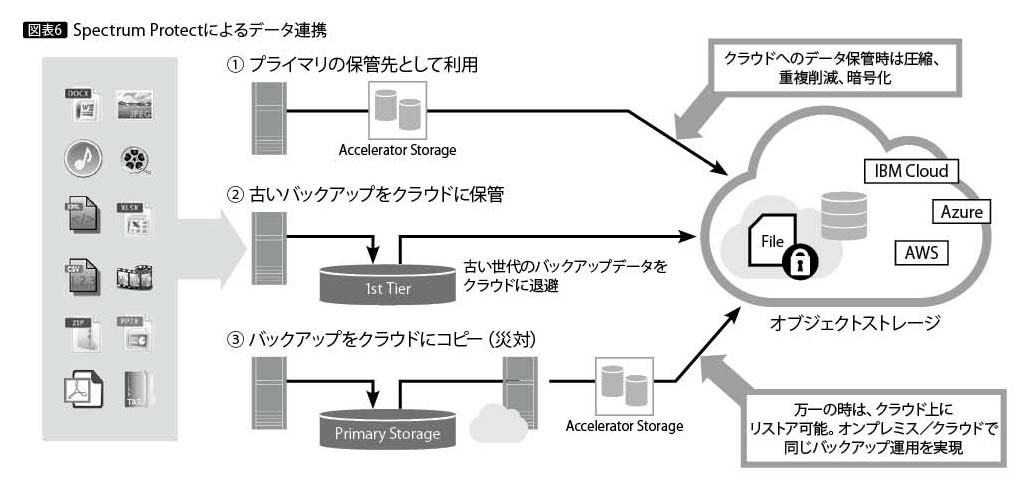 バックアップはときに大容量になりがちだが、クラウド・サービスにすべてのバックアップデータを溜め込むのは得策ではないと考える読者もいるだろう。Spectrum Protectでは、最新のバックアップはオンプレミスに保管しながら、古くなった世代のバックアップだけをクラウドに退避させるような構成も実現できる。クラウドに保管したバックアップをクラウド上にリストアして、データを取り出すことも可能である(図表6)。