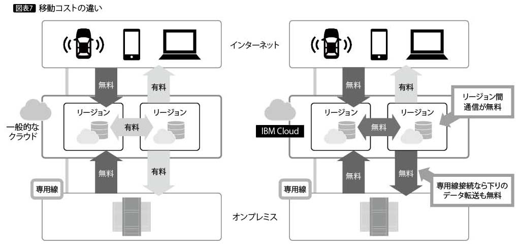 ちなみにIBM Cloudでは、データセンター間のデータ転送にコストは発生しない。プライベート・クラウドへの転送も、専用線で接続していれば無料である(図表7)。