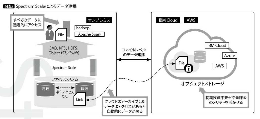 またSpectrum ScaleもSV4PCと同様に、IBM Cloudはもちろん、AWSマーケットプレイスからデプロイできる。これにより、各クラウド・サービス上にそれぞれSpectrum Scale環境を構築し、Spectrum Scaleの機能であるActive File Mana gement(AFM)を利用して、拠点間でデータを連携できる。Spectrum Scaleもまた、容易なデータ連携を実現する(図表5)。