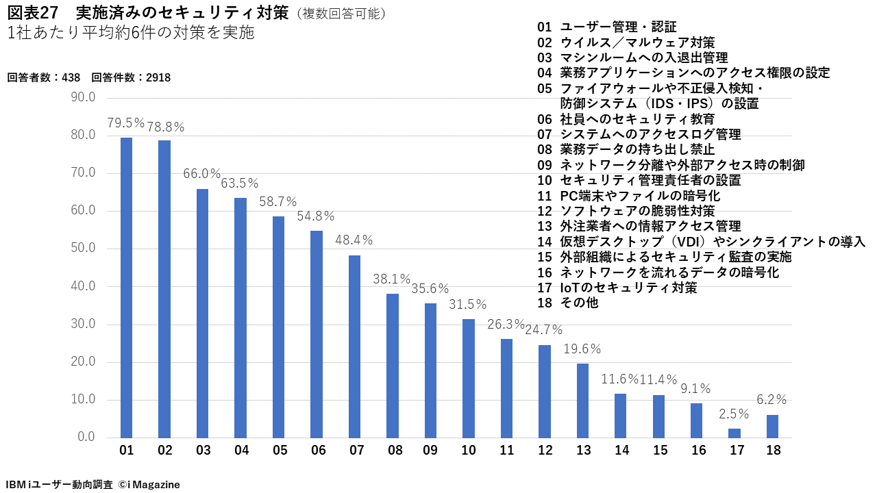 セキュリティ対策に関しては、「実施済み」(図表27)と「1~3年後に導入・実施予定」(図表28)が対照的な結果となった。実施済みと予定との間に顕著な差がある。