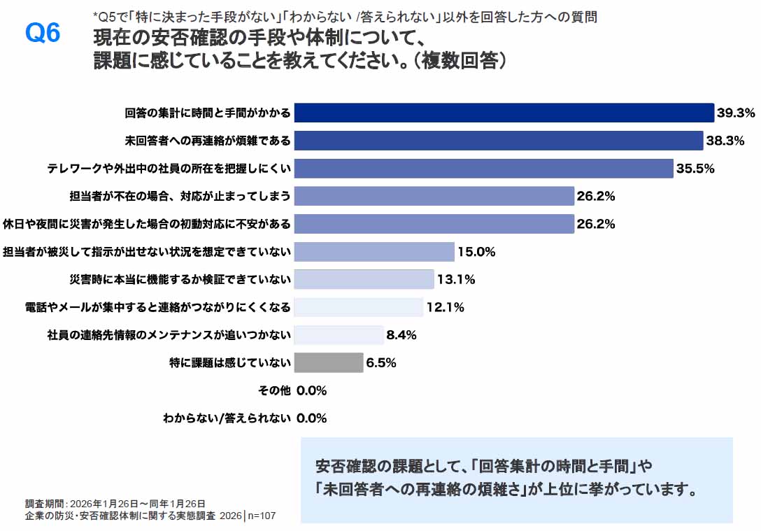 という結果だったが、「現在の安否確認の手段や体制について、課題に感じていること」へは、次のような結果になった。