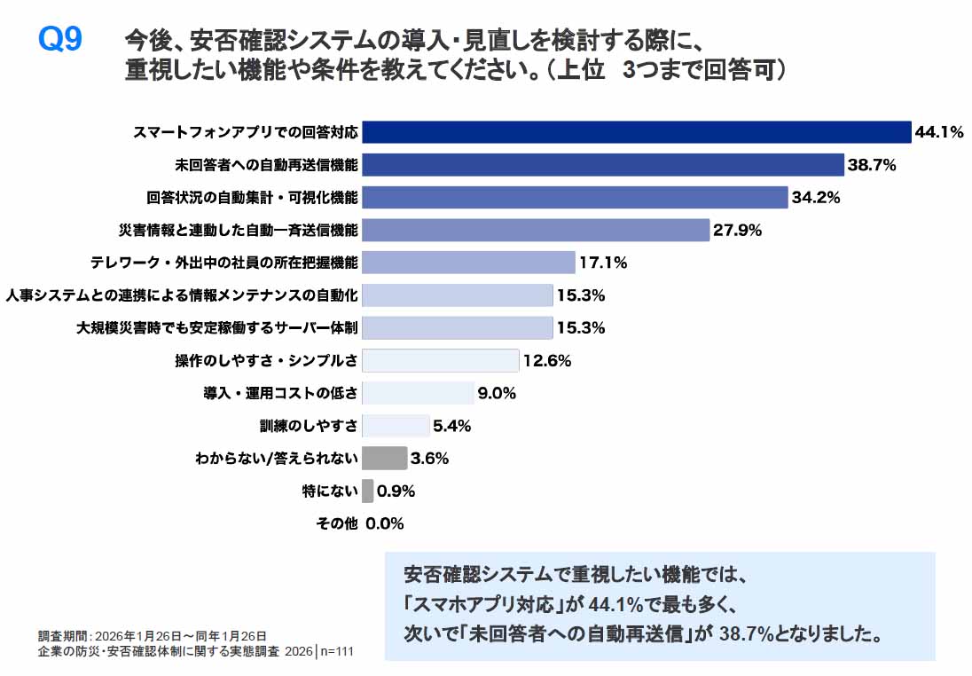 「今後、安否確認システムの導入・見直しを検討する際に、重視したい機能や条件」については、以下の回答であった。