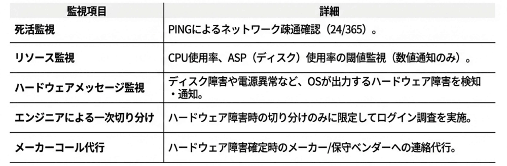 ちなみに「一次切り分け」は、アラート検知後にエンジニアがリモート接続などで状況を確認し、ネットワークやOS、アプリケーションなど障害発生箇所を特定する。「障害一次代行」は、事前に合意した手順書に基づき、プロセス再起動後の復旧作業を代行する。「メーカー連携」は、ハードウェア障害疑い時にメーカーや保守ベンダーへのコール代行までを実施する。