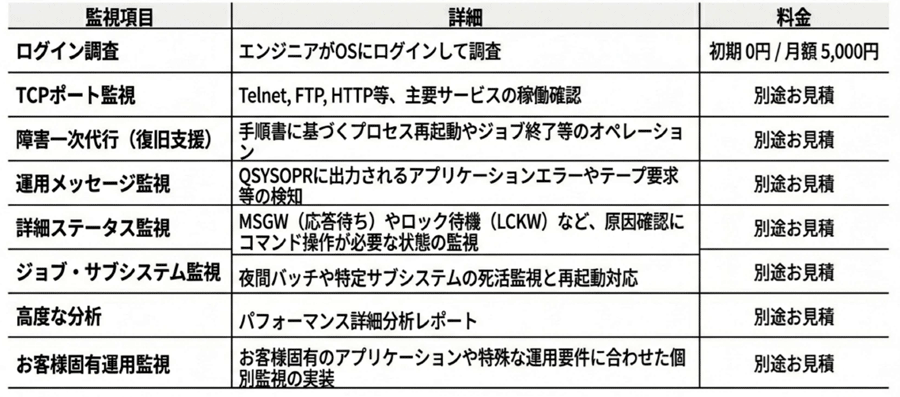 またオプション料金による追加監視メニューには、「ログイン調査」「TCPレポート」「障害一次代行(復旧支援)」「運用メッセージ監視」「詳細ステータス監視」「ジョブ・サブシステム監視」「高度な分析」「お客様固有運用監視」などがある。
