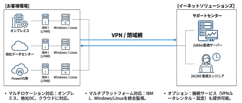さらにマルチロケーション対応とマルチプラットフォーム対応も、大きな強みであろう。マルチロケーション対応、すなわちオンプレミス、他社データセンター、各種クラウドサービスのPower環境に幅広く対応していること。そしてマルチプラットフォーム対応、すなわちIBM i、Windows、Linux、ネットワークなどをワンストップで統合監視できることである。