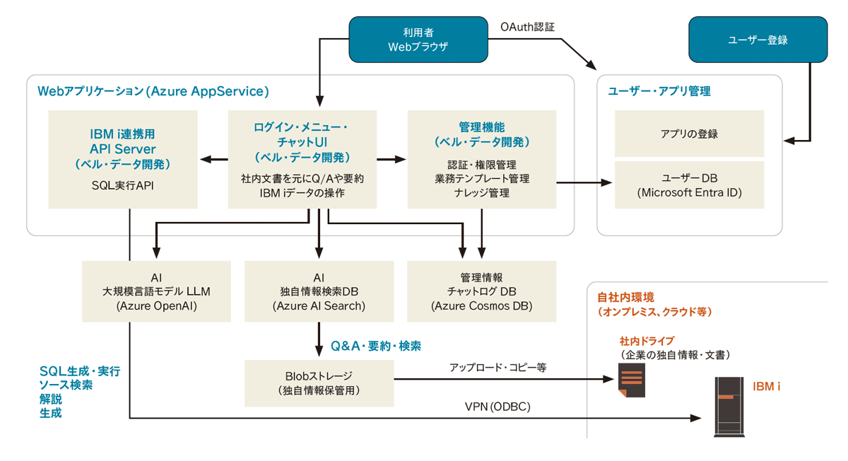 IBM iユーザーを対象に、生成AIのチャットアプリを通して、大規模言語モデル(LLM)がもつ一般的な学習情報に、IBM i内の資産や社内ドキュメントを組み合わせることで、IBM iにおけるIT業務の支援やアドバイス、新たなアイデア創出などを可能にするクラウドサービスである(図表1)。