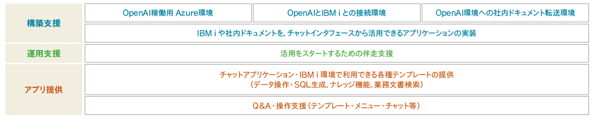 また導入時の構築支援サービスは、同サービスを利用するために必要となるAzure上の各種準備を一括でサポートする。具体的には、「アプリケーションを動かすための環境」「Azure OpenAI を利用するための連携設定」「IBM iと接続するための仕組み」、そして「社内ドキュメントを活用する環境」の構築を支援する。さらに導入後は、活用を支援するための伴走支援サービスも提供される(図表3)。