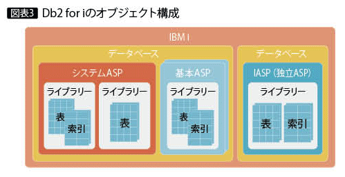 運用管理性や可用性については、IBM i OS環境のレベルで担保する。Db2 for LUWでは1つのインスタンスに対して明示的にデータベースを作成するが、Db2 for i ではIASP (独立補助記憶域プール) と呼ばれる、IBM i の稼働中に構成をオフ・オンできる補助記憶域プール(ストレージ領域の論理的なグループ)を構成しない限り、1つのIBM i には1つのデータベースが構成される。IASPを構成した場合には、IASP自体がDb2 for i での1つのデータベースとして振る舞う(図表3)。