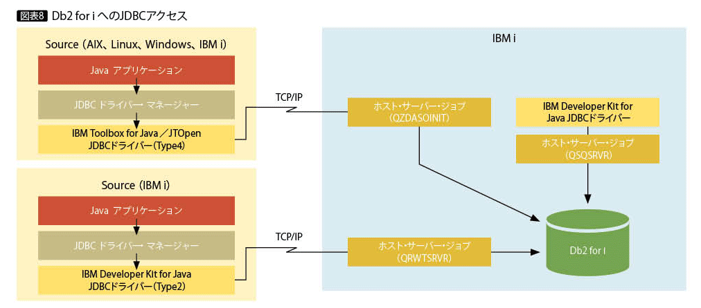 図表8は、JDBCドライバーでDb2 for i に接続するイメージである。Db2 for i に接続するアプリケーションがIBM i以外のOSで稼働する場合には、IBM Toolbox for JavaもしくはJTOpenのType4ドライバー経由で接続され、Db2 for i 側としてはホスト・サーバー・ジョブQZDASOINITに処理が割り当てられる。