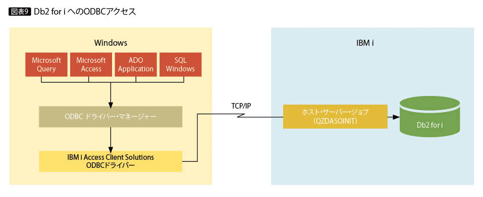 またLinux用のODBCドライバーは同様に、「IBM i Access Client Solutions Linux Application Package」に同梱されている。図表9は、ODBC接続のイメージである。Db2 for i 側には、ホスト・サーバー・ジョブQZDASOINITが割り当てられる。