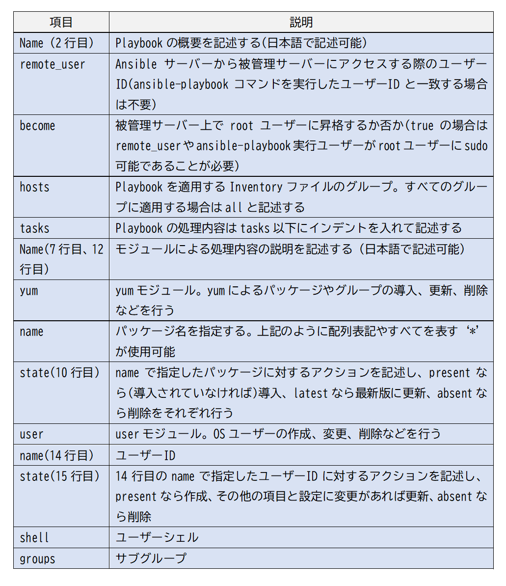 PlaybookはYAMLフォーマットで記述する。Playbookは大きく分けて、2~5行目のようにPlaybookの基本設定を記述する部分と、6行目以降のように被管理サーバーに適用する構成管理の内容を記述する部分に分かれる。